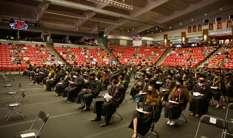 The ceremonies were markedly different than in the past, with distanced seating for the graduates on the floor of the O’Reilly Family Event Center, limited and distanced seating for guests in the stands, and everyone wearing masks. Yet the events still held the same sense of excitement for graduates and their families, marking “both a conclusion and a beginning” as provost Dr. Beth Harville said in opening remarks.