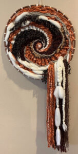 Medium: wool, copper and acrylic yarn on a 16″ copper hoop