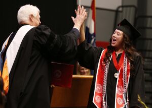 Missouri Board of Education President and Drury alumna Mary Schrag ’82 served as the commencement speaker. The founder and board chair of the Physical Therapy Specialists Clinic in West Plains, she spoke on the importance Drury University has played as she built her life and career.